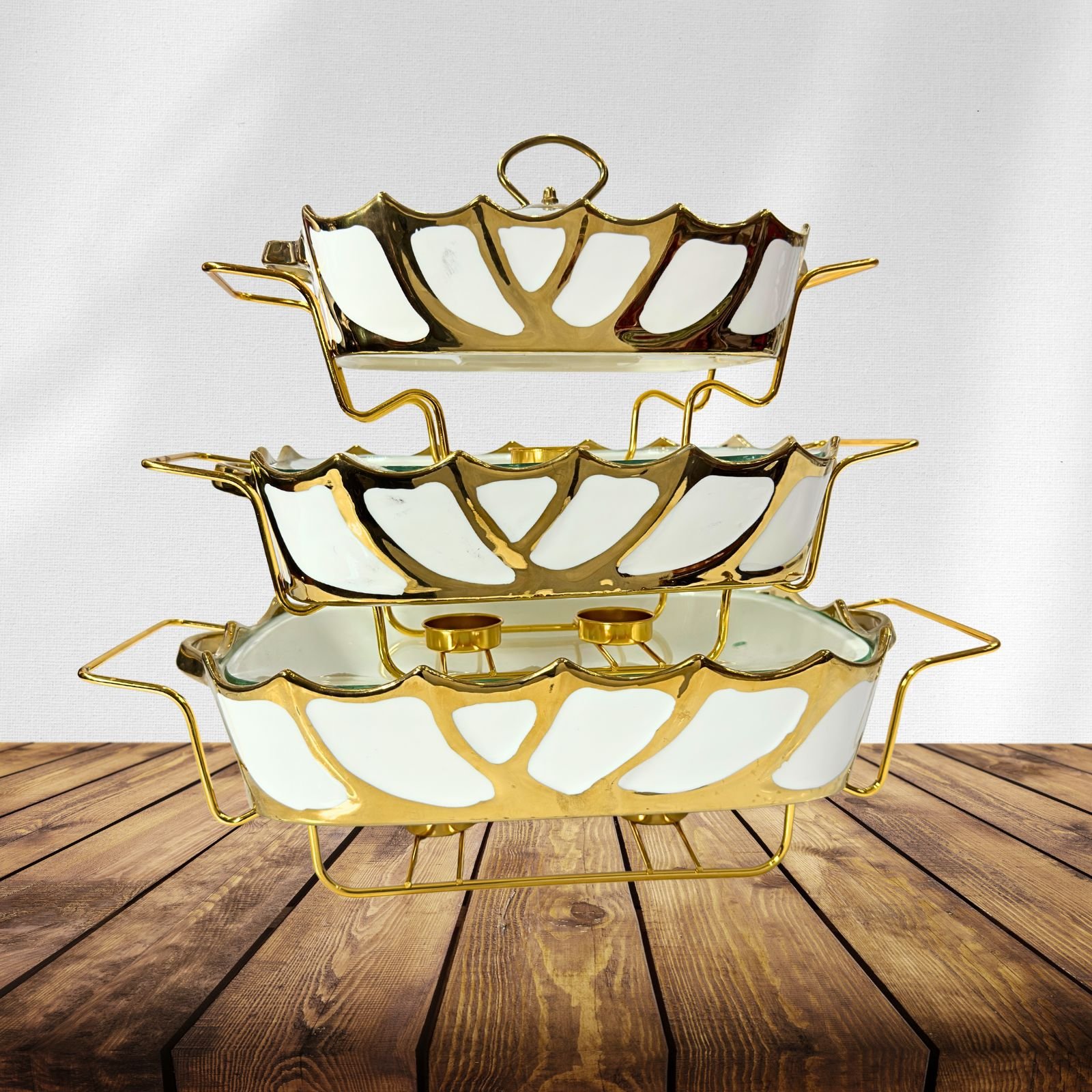 This 3-piece buffet dish set is designed to meet various serving needs. With spacious and ergonomically crafted dishes, it is ideal for keeping food warm, serving appetizers, main courses, or even desserts. The included sturdy stand not only adds a modern touch to the display but also ensures secure placement for effortless serving. Whether hosting a buffet party or a cozy dinner, this set simplifies presentation and adds an extra layer of convenience.