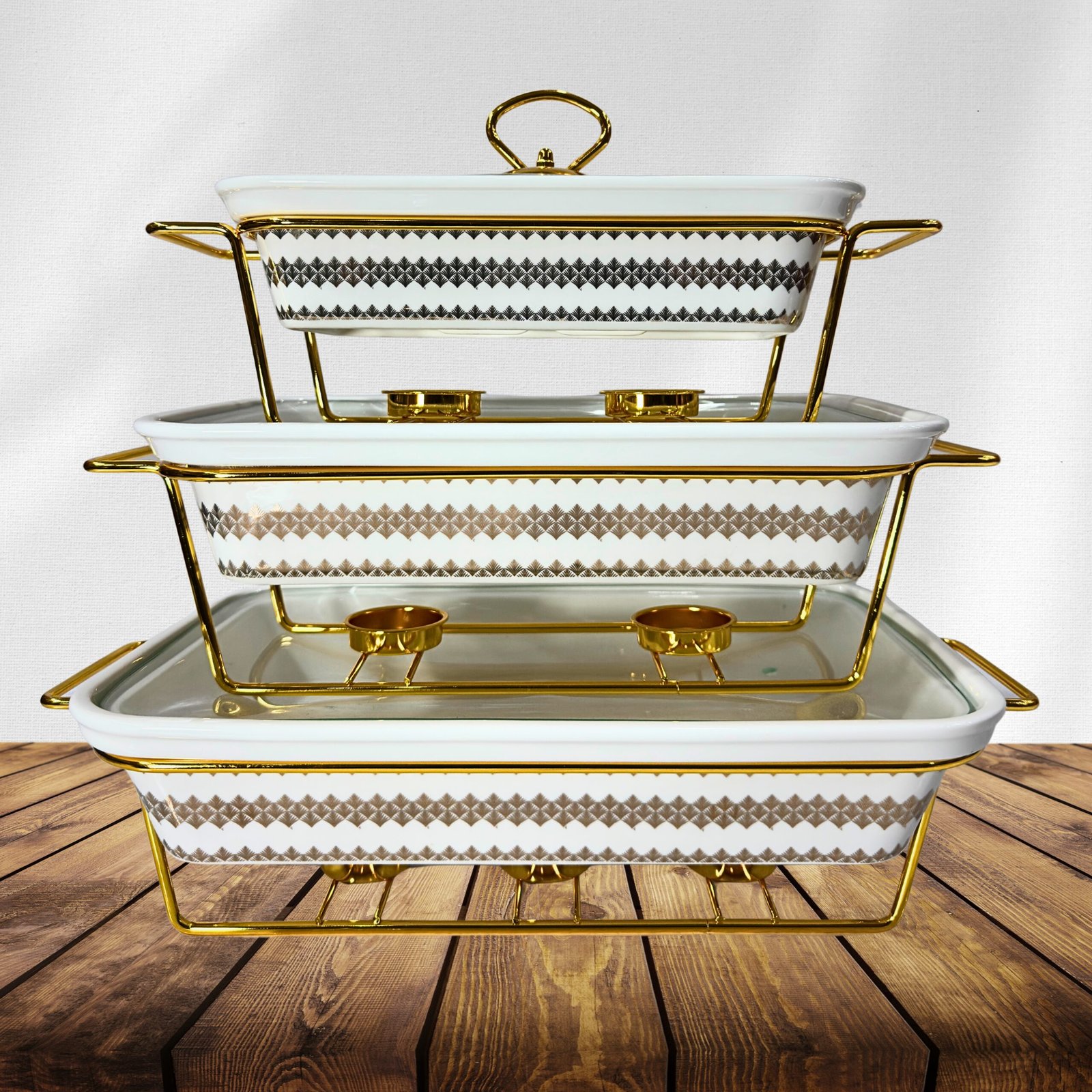 Elevate your dining and serving experience with the Buffet Dish Ceramic 3Pc Set With Stand. Crafted from high-quality ceramic, this set combines durability and sophistication to complement any occasion, whether it’s a casual family dinner or a formal gathering. The sleek, neutral-colored ceramic dishes exude timeless elegance, effortlessly blending with your existing decor while offering unmatched practicality.