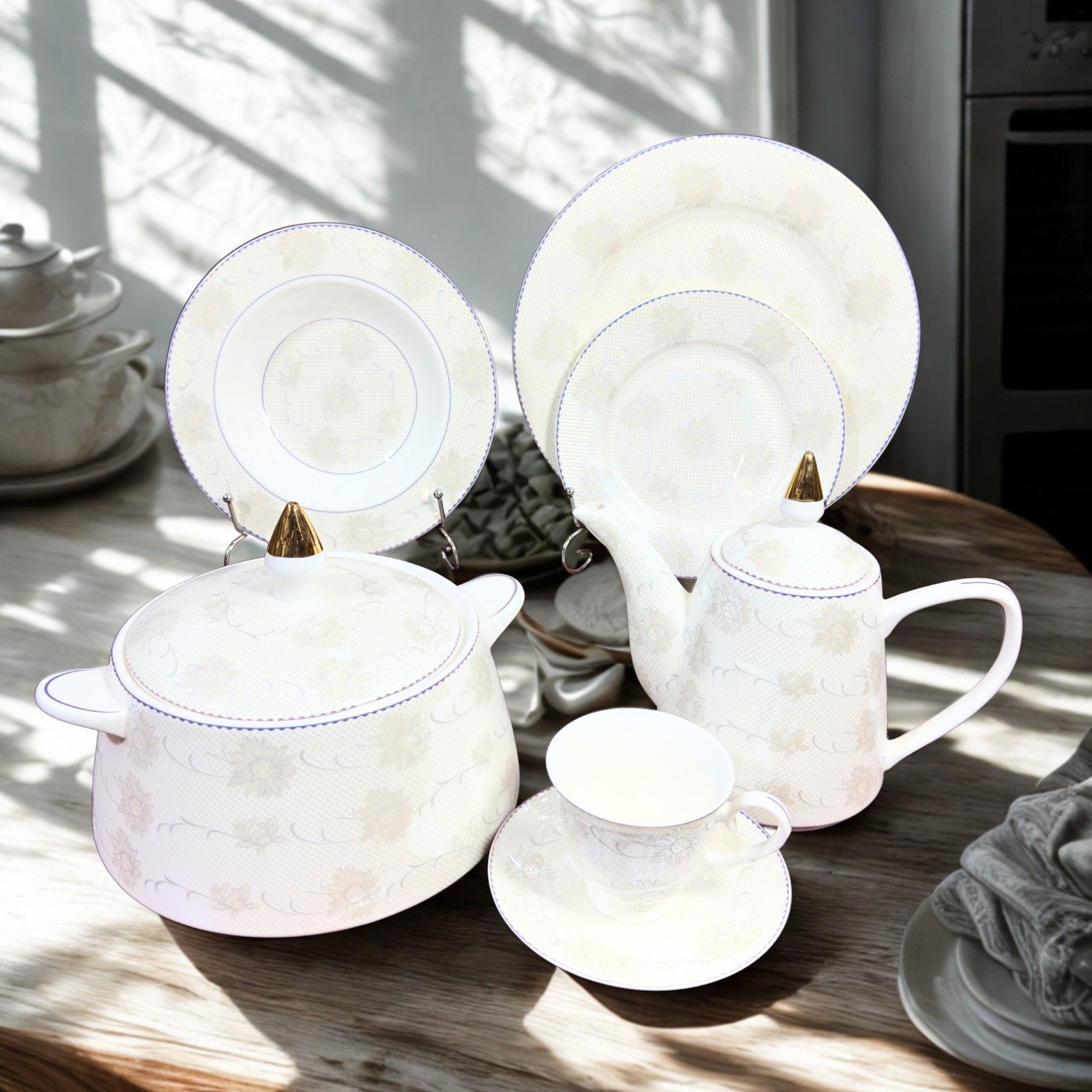 Transform your dining table into a luxurious setting with our Dinner Set Bone China 61Pc. Designed to impress guests and elevate everyday meals, this exquisite dinnerware combines unmatched durability with unmatched sophistication. Whether it’s a formal dinner or a casual family meal, this set is designed to complement any dining occasion.