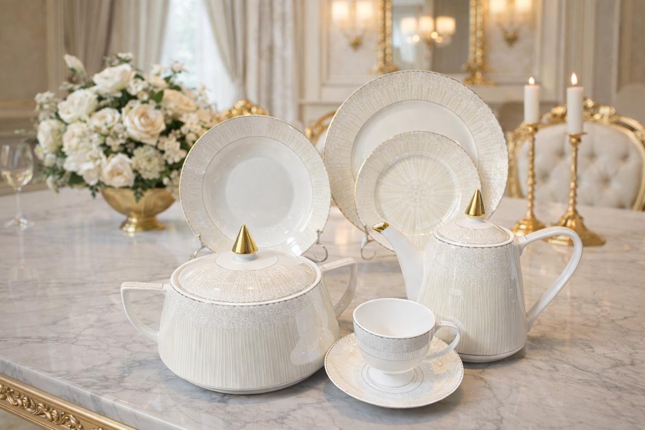 Made from premium-grade bone china, this dinner set ensures both durability and elegance. It is lightweight yet sturdy and designed to withstand the rigors of daily use, making it an ideal choice for families. The smooth, glossy finish highlights its luxurious appeal while being chip-resistant, offering long-lasting use without compromising its beauty. This set is not only practical, but it also transforms your table setting into a statement of understated luxury.
