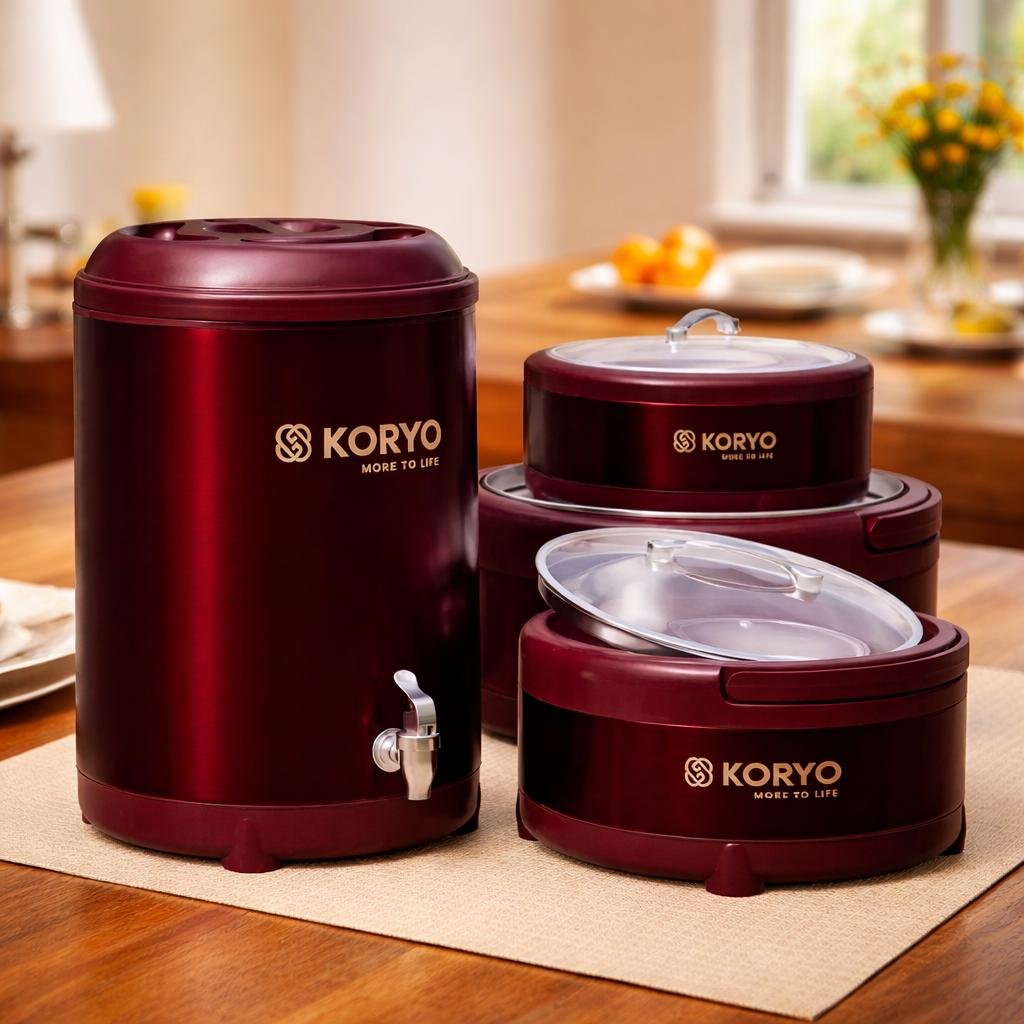 Premium KORYO insulated dining set designed to keep food and water hot or cold for hours. Elegant finish, durable build, and perfect for daily use or special dining occasions